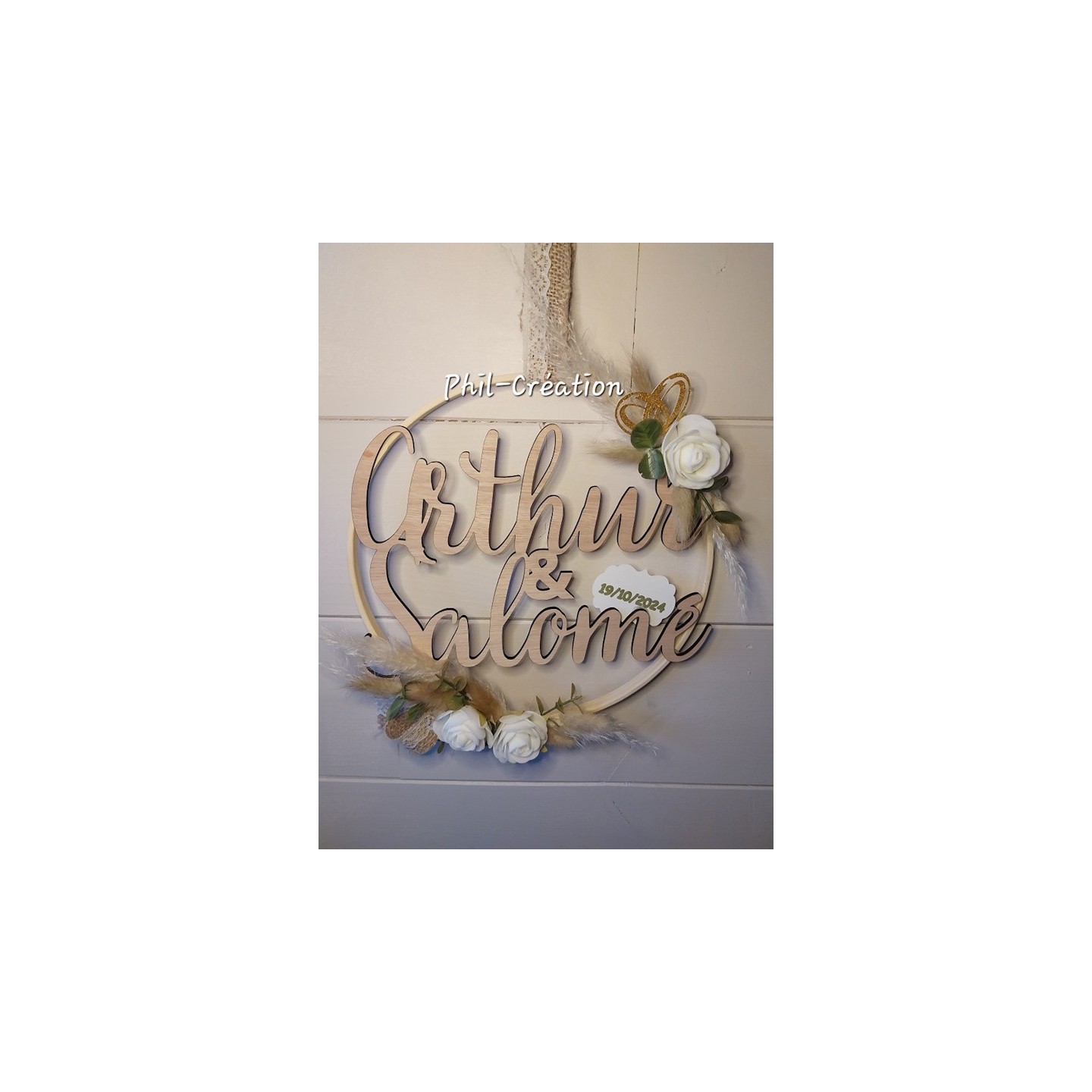 Rond en bois environ 30cm avec prénoms découpes et fleurs